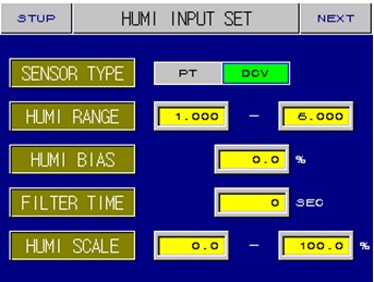 圖表 7-1-2 濕度設(shè)定 SENSOR TYPRE(濕度傳感器):選擇濕度傳感器的類型 HUMI RANGE (濕度范圍):選擇濕度的范圍 HUMI BIAS(補(bǔ)償):濕度補(bǔ)償設(shè)定 FITER TIME(濕度噪聲設(shè)):消除由于高頻噪聲影響的濕度顯示 HUMI SCALE 只出現(xiàn)電壓入力時(shí)顯示:設(shè)定所需要有使用電壓入力的濕度對(duì)應(yīng)范圍