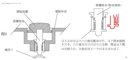 上圖的按鍵組合在很多鐘表產(chǎn)品上都用過,一般都能達(dá)到IP46等級(jí),防水效果符合多數(shù)要求.而且體積小,在許多鐘表配件生產(chǎn)廠家是做為成品生產(chǎn)的,從長(zhǎng)度,最大外徑,防水等級(jí)有多種規(guī)格選擇.在產(chǎn)品空間較小時(shí)建議用此結(jié)構(gòu)方案.